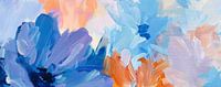Het palet bestaat voornamelijk uit zachte blauwtinten en lavendelpaars, aangevuld met subtiele warme accenten in oranje en perzik. De penseelstreken zijn breed en dynamisch, wat een gevoel van beweging en vloeiendheid creëert. De kleuren…