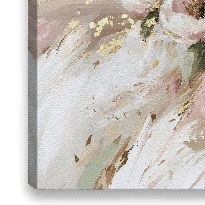 Een abstracte schildering van delicate pioenrozen in zachte pastelkleuren. Het subtiele gebruik van gouden accenten voegt een vleugje luxe toe aan het kunstwerk, perfect voor een romantisch interieur.
