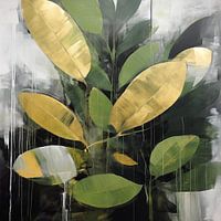 Gouden bladeren schitteren als schatten te midden van de groene en grijze achtergrond, waardoor een gevoel van wonder ontstaat. Dit schilderij herinnert ons aan de pracht en mysterie van de natuur en nodigt uit tot diepere overpeinzing over onze relatie met de tropen.