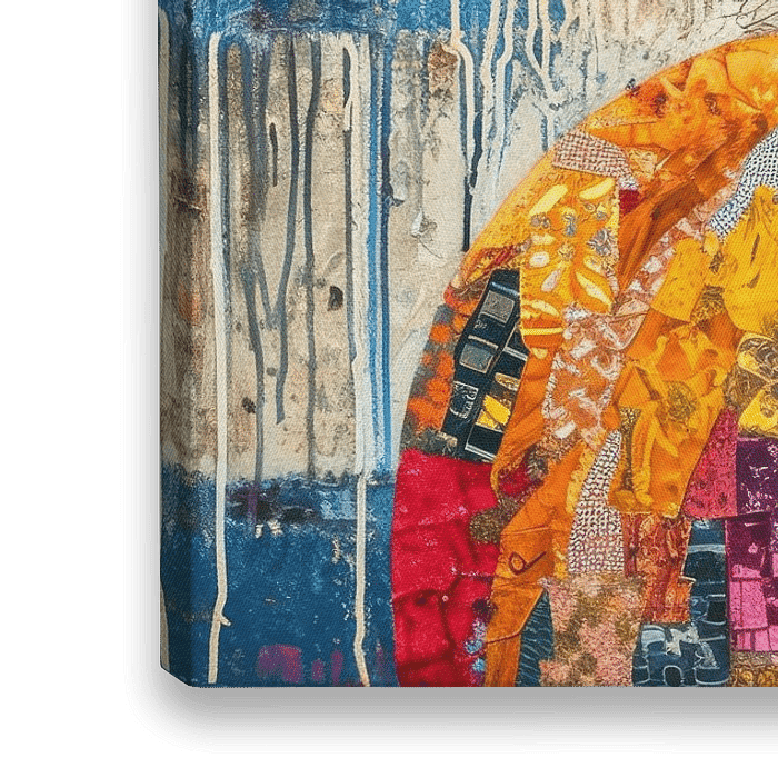 Een Schotse Hooglander, uitgevoerd in een rijk mozaïek van patronen en kleuren. Het lijkt alsof elk stukje van de collage specifiek is gekozen om de natuurlijke textuur en de robuuste uitstraling van dit prachtige dier te benadrukken.