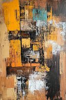 Deze energieke abstracte compositie is opgebouwd uit gelaagde texturen en rechthoekige vormen in krachtige kleuren zoals diepzwart, goudgeel, roestbruin en accenten van turkoois. De dikke verfstructuren en ruwe penseelstreken geven het werk een industriële, bijna stedelijke uitstraling, als een visuele echo van muren, ramen en stadslagen. Ideaal voor moderne interieurs die op zoek zijn naar dynamiek en karakter.