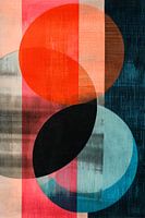 Dit trendy kunstwerk is een visueel intrigerende compositie die speelt met de perceptie van ruimte en diepte door het gebruik van overlappende cirkelvormen en strepen in een verscheidenheid aan kleuren.