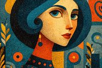 Abstracte Vrouw | Blauwe Haar Vrouw - Op dit vrouwen schilderij zie je een vrouw met een opvallende blauwe haarstijl en een kleurige achtergrond vol geometrische vormen en bladeren, die een moderne en abstracte uitstraling hebben.