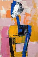 Details: abstract schilderij, vrouwelijke figuur, moderne kunst, blauw, geel, roze, gris, minimalistisch, geometrisch, kleurrijk