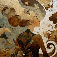 Abstracte Vrouw met Bloemen - Op dit vrouwen schilderij zie je een vrouw met prachtig, golvend haar in warme bruin- en goudtinten, omringd door florale en bloemige patronen die een moderne, abstracte uitstraling geven.