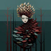 Ervaar de betovering van rust en sereniteit met deze intrigerende abstracte afbeelding. Een subtiel gevormd vrouwenhoofd, met gesloten ogen die een diepe kalmte uitstralen, komt tot leven te midden van een weelderige compositie van bladeren en takken. De harmonieuze kleurenpalet van bosgroen, aardetinten en zachte blauwen omarmt de kijker, waardoor een gevoel van verbondenheid met de natuur ontstaat.