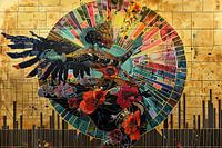 Details: abstract, vrouw, figuur, kleurrijk, bloemen, silhouet, vleugels, goud, zwart, stedelijk