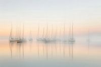 Een eindeloze zomerdag aan zee, waar de lucht en de horizon versmelten tot een zacht gekleurd canvas. Zeilboten glijden moeiteloos over het wateroppervlak, hun beweging gevangen in een zachte onscherpte die een abstracte en creatieve sfeer oproept.