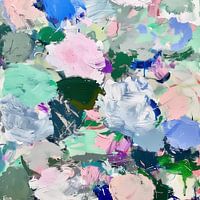 Levendig abstract schilderij met een uitbarsting van kleuren en een dynamische compositie. De artistieke uitvoering met breed en variërend paletmesgebruik resulteert in een textuur die zowel visueel als tactiel rijk is. Het kleurenpalet bestaat uit een combinatie van zachte pastels en diepere tonen, waaronder roze, blauw, groen, en wit,…
