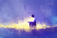 Abstracte Werkomgeving - Op dit abstract schilderij zie je een figuur die aan een bureau zit en lijkt te werken op een laptop, omringd door een etherische achtergrond in zachte paarse en gele tinten, wat een dromerige sfeer oproept.