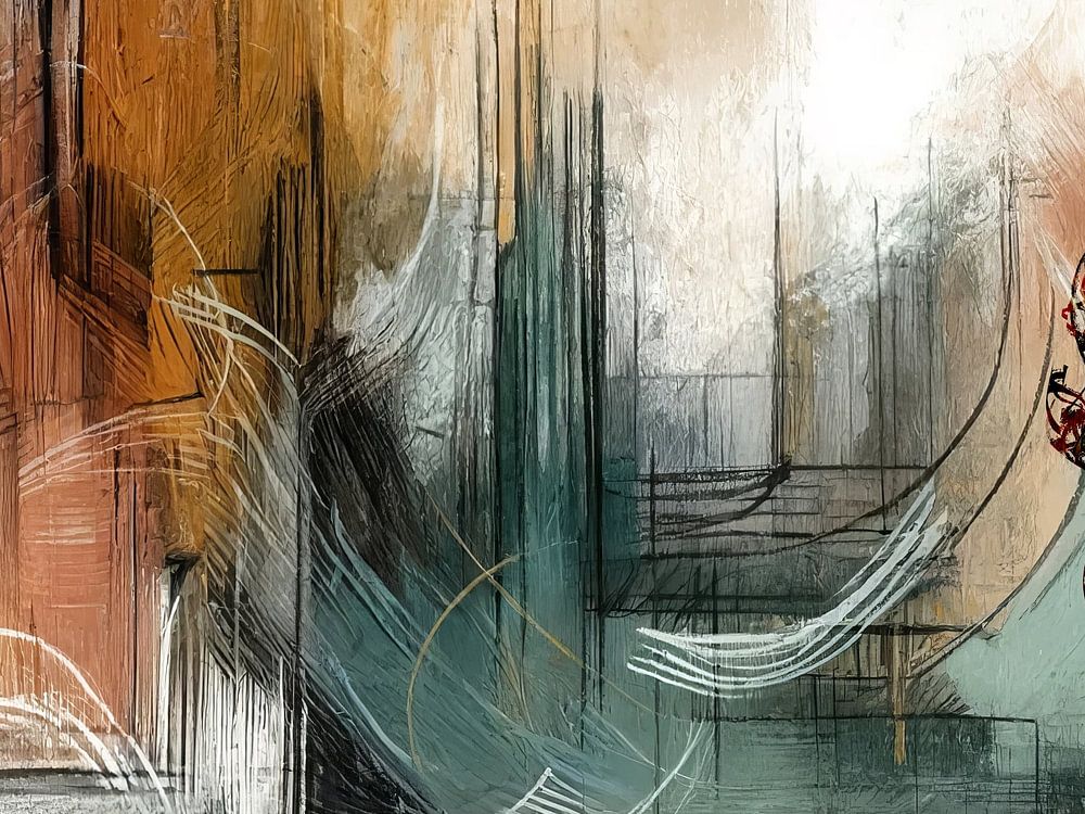 “Abstracte Ziel” is een fascinerend kunstwerk dat de complexe innerlijke wereld van de mens verkent door middel van abstracte vormen en lijnen. Het beeld toont een menselijke figuur, getekend met losse, vloeiende lijnen, die lijkt te zweven in een dynamische en gelaagde stedelijke omgeving. De combinatie van warme aardetinten met koele blauw- en grijstonen creëert een intrigerend contrast dat de aandacht trekt en de diepte van het werk benadrukt.