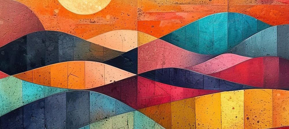Details: abstract, modern, zonsondergang, heuvels, kleurrijk, rood, geel, blauw, oranje, groen, zwart