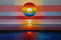 Dit dynamische kunstwerk, met zijn levendige kleuren en scherpe lijnen, vangt de essentie van een zonsondergang op een abstracte manier. De warme gloed van oranje en geel contrasteert met de rustgevende blauwe en rode tinten, wat een gevoel van harmonie en rust creëert. Het ontwerp nodigt uit tot reflectie en biedt een modern accent in elk interieur. Perfect voor in de woonkamer of kantoor, dit stuk zal een gespreksonderwerp zijn en de verbeelding prikkelen.