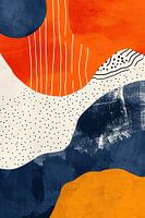 De compositie is een samenstelling van abstracte vormen die op een speelse wijze over het canvas zijn verspreid, waarbij de oranje en blauwe tinten elkaar perfect aanvullen en een visueel aantrekkelijk contrast vormen. De grote, vloeiende vormen lijken te zweven en creëren een gevoel van beweging en diepte, terwijl de toevoeging van fijne stippen en strepen een subtiele textuur en complexiteit toevoegt. Het kunstwerk straalt een zekere rust en balans uit, typerend voor de minimalistische esthetiek, en nodigt de kijker uit om een moment te pauzeren en zich te verdiepen in de details.