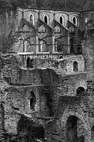 Abstract monochroom uitzicht op de abdij van Villers in Villers-la-Ville, Wallonië, België. Met de herhalende architecturale patronen van deuropeningen en ramen. Het kunstwerk is geïnspireerd op een surrealistisch werk van Escher.