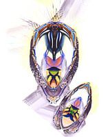 Het beeldt het hoofd van een aliën uit, een buitenaards wezen, met een kleiner hoofd erbij. Een witte achtergrond met paarse lijnen. Als je goed kijkt in het hoofd dan zie je verschillende figuren, waaronder een valk. Sommigen zien er juist geen aliën in maar juist een…