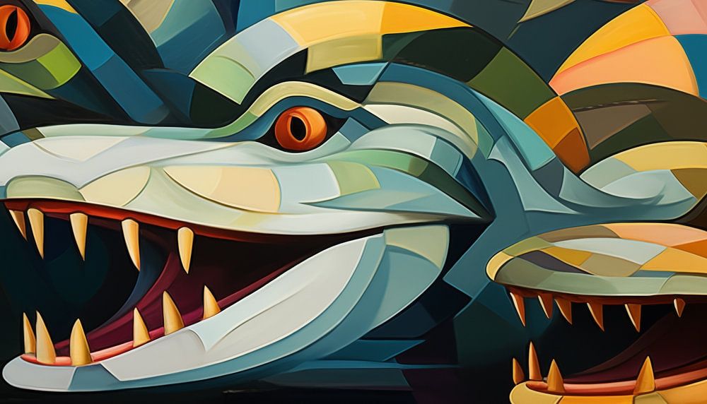Abstracte alligator kubisme panorama schilderij met een prachtige en unieke stijl. Met prachtige kleurtinten en een uniek ontwerp maakt dit tot een stijlvolle fotoprint die prachtig staat in elke ruimte. 100% uniek en origineel!