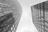 Deze indrukwekkende zwart-witfoto toont twee majestueuze wolkenkrabbers die van onderaf steil de lucht in zijn gefotografeerd. Deze abstracte afbeelding creëert een fascinerend perspectief, terwijl de monochrome omzetting de structuren en lijnen benadrukt. De torens lijken zich eindeloos naar boven uit te strekken en de fijn getekende lucht vormt een perfect canvas waarop de twee hoofdpersonen zijn getekend.