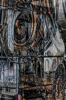 Gedeeltelijke weergave van een oud huis, Balkon, Ijzeren traliewerk, Oud huis, Abstractie, Digitale kunst, Lijnen, Geometrische vormen, Ramen, Deuren, Illustratie, Grafisch, Modern, Abstract, Surrealistisch, Magisch, Mystiek, Trend kleur sereniteit, Spiritueel, Magisch,Mystiek