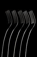 Abstracte artistieke foto van metalen couvert, zijnde vijf roestvrij stalen staande vorken in een donkerveld opstelling in een studio