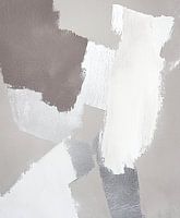 Abstracte compositie in een ingetogen palet van grijstinten, wit en subtiele accenten van beige. De brede, hoekige penseelstreken overlappen elkaar, wat een gevoel van beweging en diepte creëert binnen de minimalistische structuur. De textuur van de verf is duidelijk zichtbaar, waarbij sommige vlakken dik en grof zijn aangebracht, terwijl andere delen gladder zijn. Dit spel van contrasten in zowel textuur als kleur geeft het werk een dynamisch maar toch rustgevend effect.