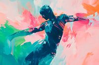Een harmonieus samenspel van levendige kleuren en vloeiende vormen voert de kijker mee naar een wereld van creativiteit en beweging. De dynamische uitdrukking van het silhouet wekt inspiratie en energie op. Dit kunstwerk vindt zijn ideale plaats in de woonkamer of op kantoor, waar het gesprekken stimuleert en de ruimte vult met een positieve sfeer.