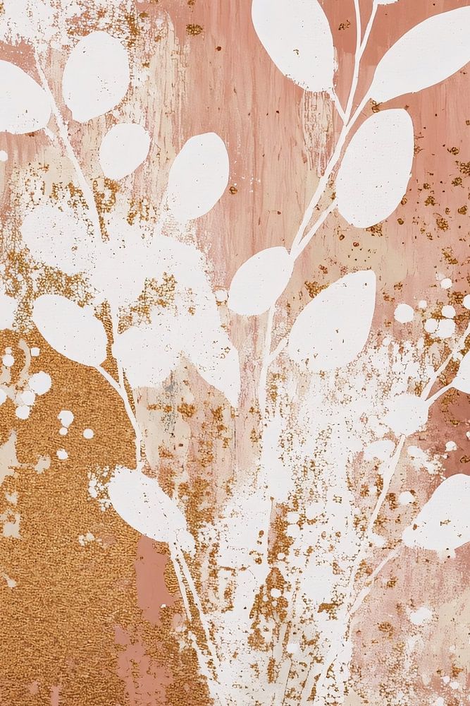 Dit unieke ontwerp combineert abstractie en natuur op een prachtige manier. Met zachte tinten zoals roze, beige en taupe, brengt het een rustgevend gevoel in elke ruimte. De witte, gestileerde bladeren vormen een speels contrast met de spetters en organische texturen op de achtergrond. De gouden accenten voegen een vleugje luxe toe aan het ontwerp. Dit schilderij is perfect voor moderne interieurs, vooral in een slaapkamer of kantoor, waar het een vleugje verfijning en rust kan brengen. De minimalistische maar warme compositie maakt het ook geschikt voor verschillende stijlen, van minimalistisch tot eclectisch.