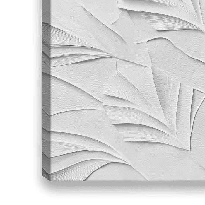 verfijnde, monochrome compositie van overlappende bladeren, uitgevoerd in wit met een subtiel reliëf. De bladeren hebben een elegante, waaiervormige structuur, vergelijkbaar met ginkgobladeren, en worden gekenmerkt door hun gracieuze lijnen en fijne nerven. De delicate schaduwen tussen de vormen creëren een gevoel van diepte en voegen een dynamisch spel van licht en schaduw toe aan de anders minimalistische compositie.