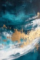 Een harmonieus samenspel van diepblauwe en zachtwitte strepen, afgewisseld met glinsterend goud, creëert een kalme elegantie. De dynamische, vloeiende vormen geven beweging en expressie aan de kamer. Ideaal voor de woonkamer, waar het zowel een blikvanger als een rustgevend element kan zijn en een ontspannen sfeer creëert.