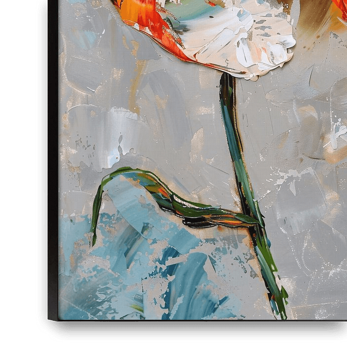 Dit prachtige abstracte schilderij toont een bloem in levendige oranje, witte en groene tinten. De dynamische penseelstreken en rijke texturen geven het stuk een levendig en energiek karakter, perfect om elke ruimte op te fleuren. Het kunstwerk straalt moderniteit en elegantie uit, ideaal voor liefhebbers van hedendaagse kunst. Plaats…