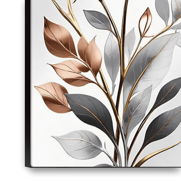 Een witte abstracte bloem met rosé gouden, grijze en witte bladeren. Geef je interieur een moderne en chique uitstraling.