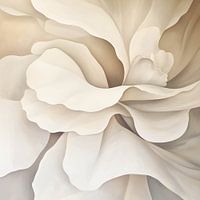 Verfijnde en zachte weergave van een bloem in een monochroom kleurenpalet van wit, beige en grijstinten. De bloembladen zijn in elkaar verweven in vloeiende, sierlijke lijnen, wat een gevoel van diepte en beweging creëert. De compositie straalt elegantie en rust uit door de subtiele overgangen tussen de tinten en de zachte contouren van de bloembladen. De artistieke benadering heeft een bijna etherische kwaliteit, waarbij de bloem lijkt te zweven of op te lossen in een droomachtige sfeer.