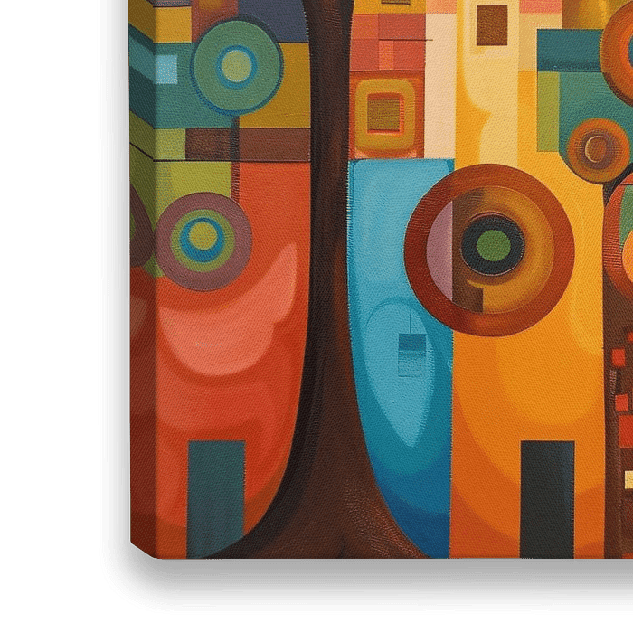 Dit levendige kunstwerk brengt een speelse en moderne draai aan het traditionele landschap. Abstracte vormen en schitterende kleuren vermengen zich om een bos van bomen voor te stellen die zich uitstrekt in een stedelijke omgeving. De contrasterende tinten van oranje, rood, geel en groen op een warme achtergrond van bruine tonen creëren…