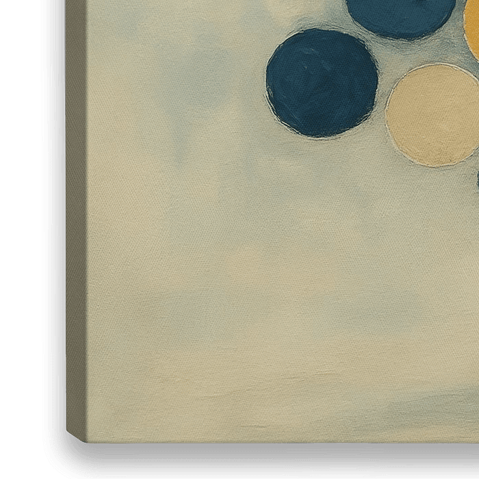 Een gestileerde boom met cirkelbladeren in diepe blauwtinten, warm goud en helder wit staat centraal. Een slanke, donkere stam draagt perfecte ronde vormen die ritmisch over de kroon zijn verdeeld, terwijl een zachte, nevelige achtergrond voor rust zorgt. Het heldere kleurcontrast tussen koel blauw en warm goud trekt de blik, maar…