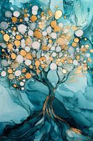 Dit kunstwerk toont een abstracte weergave van een boom, met glinsterende goud- en witte stippen die de bladeren vormen. De achtergrond bestaat uit vloeiende tinten blauw en groen, waardoor het werk een serene en kalmerende uitstraling heeft. De boom zelf lijkt zich uit te spreiden met wortels en takken die subtiel worden weergegeven in golvende lijnen, met gouden accenten die het geheel een luxe en verfijnde touch geven. Dit schilderij past perfect in een moderne ruimte, of het nu een kantoor, slaapkamer of woonkamer is, en voegt een gevoel van rust en verfijning toe aan de omgeving. Het gebruik van kleur en abstracte vormen maakt dit een intrigerend en veelzijdig stuk.