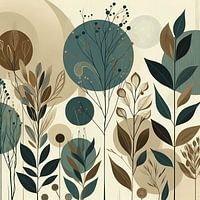 Dit digitale kunstwerk is een abstracte en gestileerde weergave van verschillende botanische elementen. De compositie bestaat uit een reeks planten met bladeren en stengels in een gedempt palet van groenblauw, bruin, crème en donkergroen. Geometrische vormen, waaronder cirkels en halve cirkels in verschillende texturen en patronen, zijn…