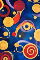 Levendige spiralen dansen harmonieus over een diepblauwe achtergrond, terwijl warm rood en zonnig geel krachtige accenten toevoegen. De dynamische compositie roept een vrolijke energie op, perfect voor de woonkamer, waar het creatieve gesprekken stimuleert en de kamer vult met levendige charme. Een blikvanger die de verbeelding prikkelt!