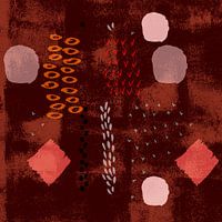 Organische vormen en markeringen in warme kleuren op roestbruine achtergrond.