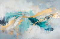 Zachte golven van turquoise en goud dansen over het doek, terwijl levendige penseelstreken de dynamiek van het leven vastleggen. Deze harmonieuze compositie straalt rust en elegantie uit en is perfect voor een woonkamer om een sfeer van ontspanning en inspiratie te creëren.