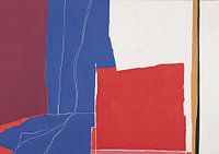Abstracte collage of schilderij waarin grote kleurvlakken in diep rood, helder blauw en licht wit tegenover elkaar worden geplaatst. De randen van de kleurvlakken zien er vaak gescheurd of onregelmatig uit, wat een tactiele kwaliteit creëert. Dunne, witte lijnen lopen door de compositie, vooral boven het blauwe gedeelte, en voegen een…