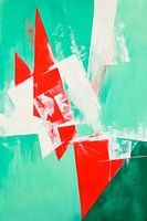 Levendige kleurcontrasten van sterk rood en zacht mintgroen geven dit kunstwerk een dynamische energie. De geometrische vormen lijken te dansen in de kamer en nodigen uit tot visuele verkenning. Ideaal voor een moderne woonkamer, het creëert een uitnodigende conversatie starter en harmonieert prachtig met minimalistische meubels.