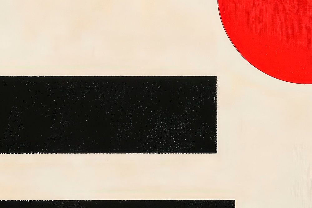Een krachtig contrast van sterk rood en diep zwart harmonieert met zachte, neutrale tinten. De geometrische vormen zorgen voor een moderne, minimalistische esthetiek die tegelijkertijd rust en dynamiek uitstraalt. Ideaal voor een woonkamer, waar hij als blikvanger fungeert en harmonieert met hedendaagse interieurs.