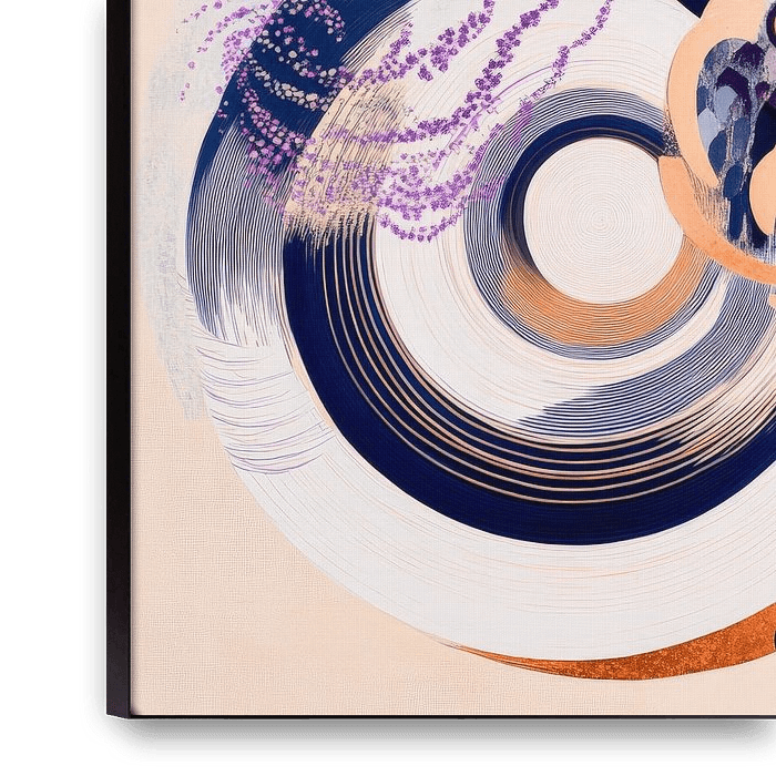 Levendige kleurtinten dansen tussen zachte rondingen en geometrische vormen, terwijl paarse bloemen een vleugje elegantie toevoegen. Deze dynamische compositie straalt creativiteit en energie uit en brengt leven in elke woonkamer, waar het gesprekken stimuleert en de verbeelding aanwakkert. Een echt hoogtepunt aan de muur!