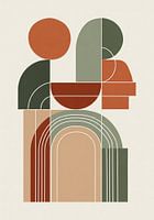 Abstracte geometrische vormen vormen een evenwichtige afbeelding met cirkels, bogen en lijnen in aardetinten tegen een lichtbeige achtergrond.