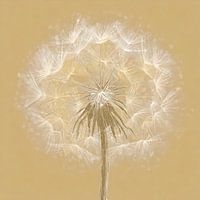 Uitgebloeide paardenbloem met witte pluizenbollen op mosterdgele achtergrond.