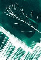 Een werk gemaakt via cyanotypie en omgezet naar donker groen. Blad van een curryplant. Abstract werk met penseelstroken.