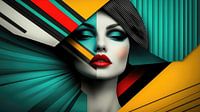 Dit fascinerende kunstwerk combineert futuristische elementen met een sterke geometrische compositie en levendige kleuren. De helft van een vrouwengezicht wordt omlijst door scherpe, abstracte vormen in felle kleuren zoals rood, geel en turquoise, die lijken te snijden in de werkelijkheid. De andere helft van het gezicht blijft verborgen, waarbij de nadruk ligt op het contrast tussen de sensuele, zachte weergave van het menselijk gezicht en de harde, strenge lijnen van de geometrische vormen.