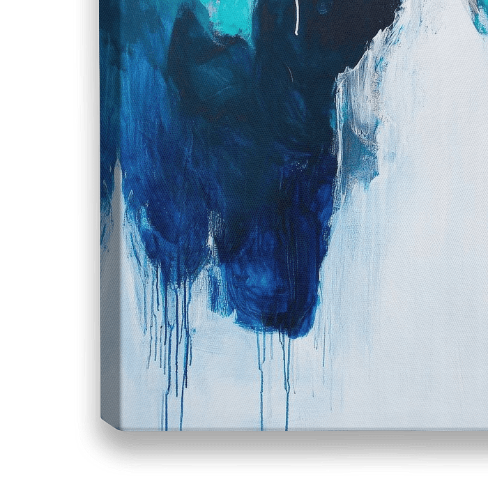 Een betoverende explosie van kleuren ontvouwt zich in zachte tinten blauw en glinsterend goud, die doen denken aan kalme oceaangolven. De vloeiende structuren en harmonieuze contrasten geven elke ruimte een rustgevende elegantie. Ideaal voor de woonkamer of een creatieve hoek waar inspiratie en ontspanning hand in hand gaan.