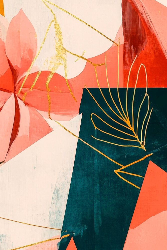 Levendige kleurcontrasten en geometrische vormen dansen tegen een diepe, rustgevende achtergrond. Delicate bloemenelementen voegen lichtheid en leven toe aan het geheel. Deze harmonieuze compositie is perfect voor de woonkamer, waar het iets biedt om over te praten en een uitnodigende sfeer creëert. De moderne esthetiek creëert een inspirerende sfeer.