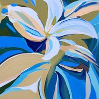 expressieve en dynamische abstracte compositie, waarin florale vormen en organische bewegingen samenkomen. De grote bloembladeren, geschilderd in een harmonieus palet van blauw, beige, wit en groene accenten, lijken te dansen en vloeien over het doek. De dikke, losse penseelstreken geven het werk een energieke en levendige uitstraling, alsof de natuur in beweging is vastgelegd.